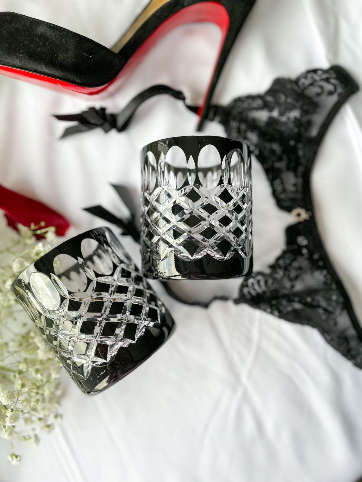 Eleganckie ręcznie malowane i zdobione kryształowe szklanki do whisky.