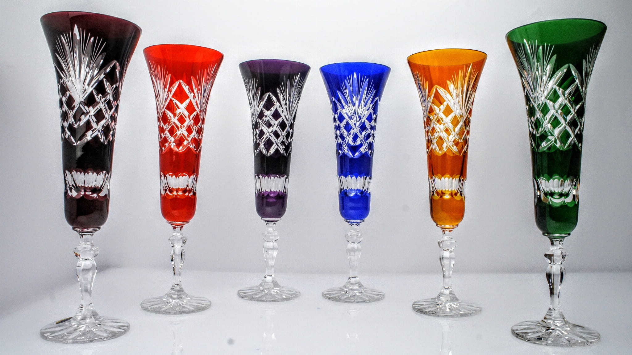 Ekskluzywne ręcznie malowane i zdobione kryształowe kieliszki do szampana, które nadają się także do win musujących.