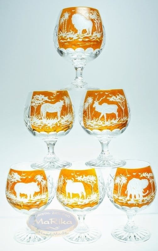 Kieliszki stworzone specjalnie do raczenia się koniakiem i brandy. Na kieliszkach ręcznie namalowane jest bursztynowe pole następnie ręcznie wygrawerowany został wzór safari. Wybierając nasze kieliszki mają Państwo pewność, że każdy element występujący na kieliszku jest wykonany z najwyższą starannością. Komplet zawiera 6 sztuk kieliszków zapakowanych w ozdobne opakowanie wyłożone białym materiałem (podgląd)