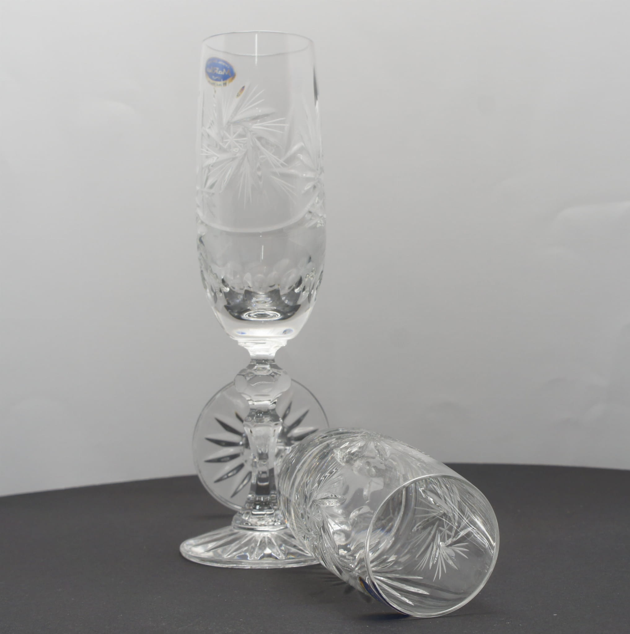 Ekskluzywne ręcznie zdobione kryształowe kieliszki do szampana, które nadają się także do win musujących.