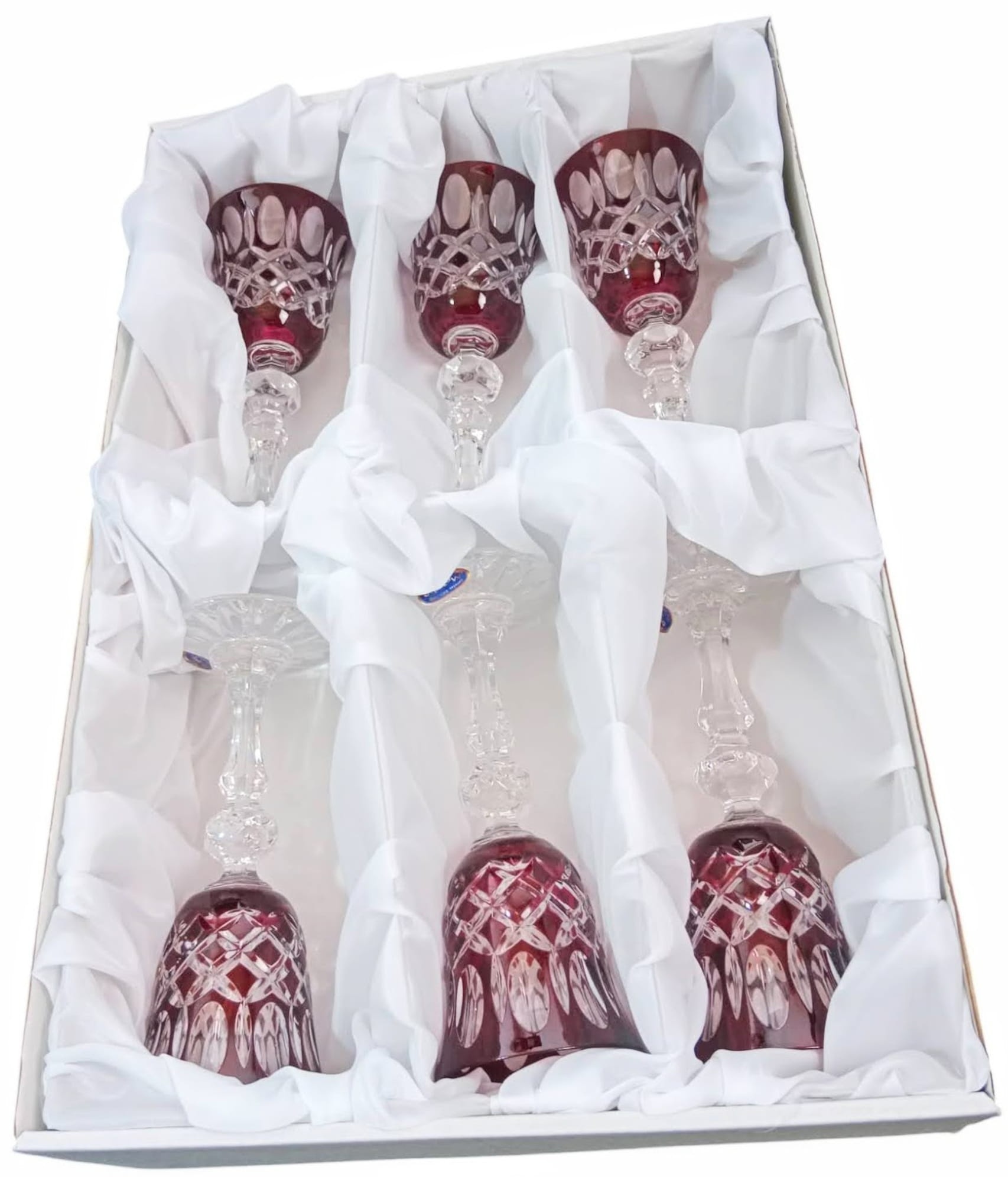 Komplet zawiera 6 sztuk kieliszków zapakowanych w ozdobne opakowanie wyłożone białym materiałem.
